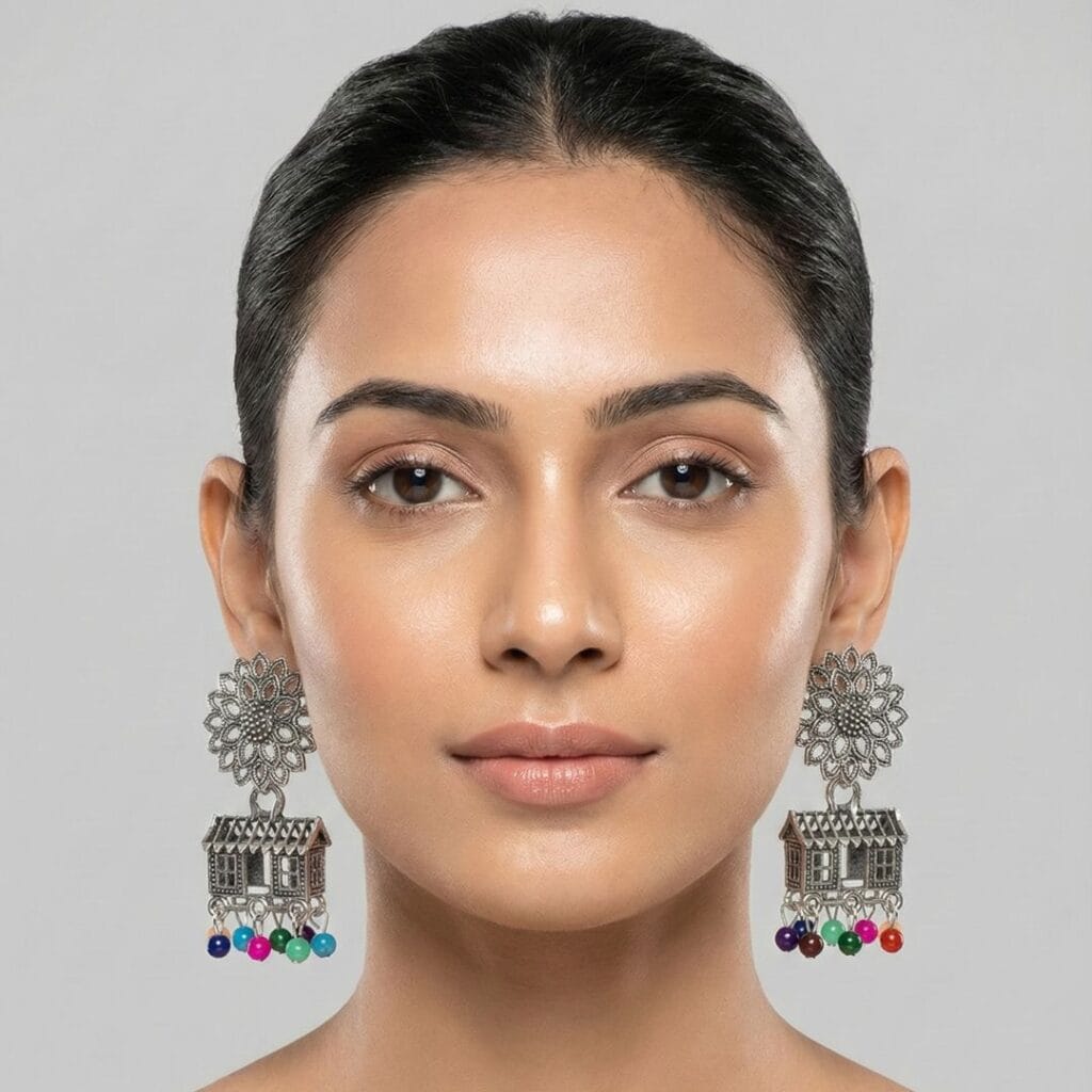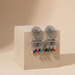 The oxidised silver finish gives these earrings a vintage, handcrafted appeal, while the playful multicolor bead drops add vibrancy and movement. Each bead sways gently with every step, making these earrings a lively statement piece perfect for everyday ethnic wear as well as casual festive styling.