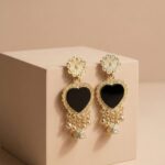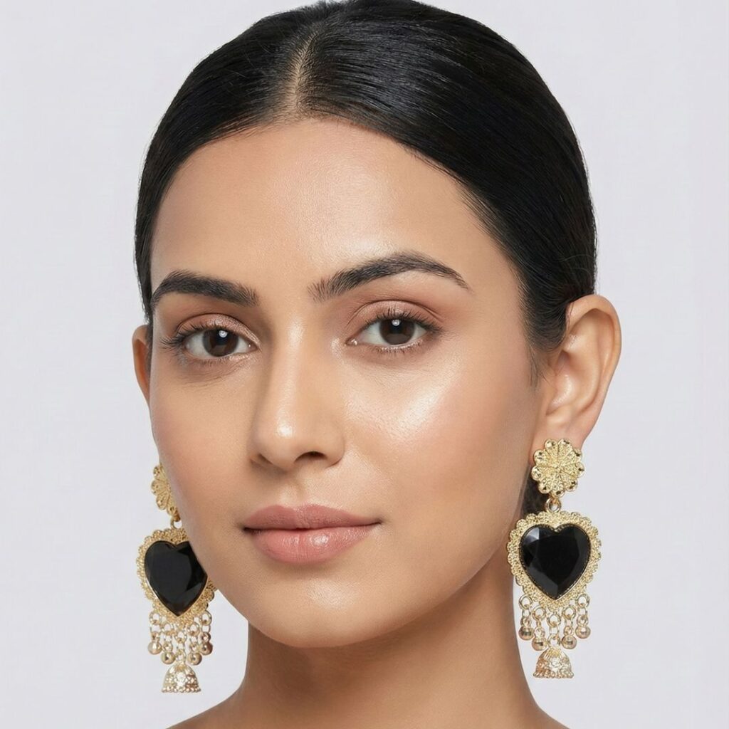 The bold black heart adds a modern twist to traditional styling, making these party wear earrings for women versatile enough for both classic and contemporary outfits. Whether styled with rich festive attire or used to elevate a simple ethnic look, these earrings instantly become the highlight of your ensemble.