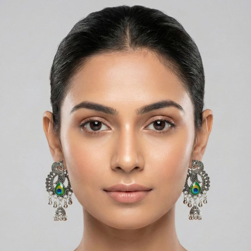 Make a royal style statement with our Peacock Charm Oxidised Silver Chandelier Earrings, crafted for women who love bold traditional jewellery with rich cultural detailing. These stunning oxidised silver chandelier earrings feature an intricately designed peacock motif, symbolising grace, beauty, and heritage making them a perfect choice for festive and wedding wear.