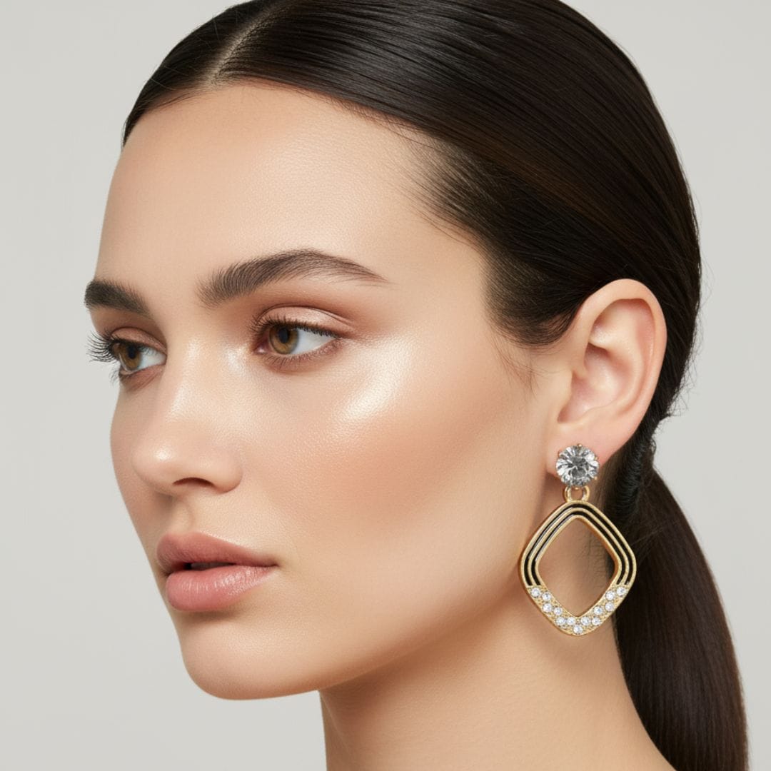 Add a modern twist to your jewelry collection with these eye-catching geometric dangle earrings. Featuring a unique open rhomboid shape in a sleek gold finish, these earrings are accented with bold black enamel stripes and a row of brilliant pavé-set rhinestones. A single round-cut crystal tops the design, providing extra sparkle. These gold and rhinestone drop earrings are the perfect blend of contemporary style and classic glamour. Ideal for dressing up a simple blouse or complementing a chic dress, they are versatile enough for both daytime and evening wear.