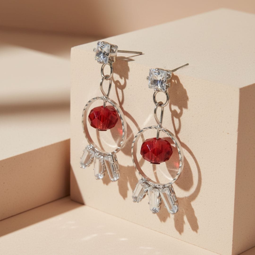 Capture attention with these striking red crystal drop earrings. Featuring a faceted, ruby-red crystal bead encased within a sleek silver-tone ring, these earrings are a true statement piece. The design is completed with a cluster of baguette-cut crystals below, adding extra sparkle and architectural detail. The post-back closure ensures a secure fit. These red stone dangle earrings are perfect for adding a pop of vibrant color and sophisticated drama to your cocktail dress or evening attire.