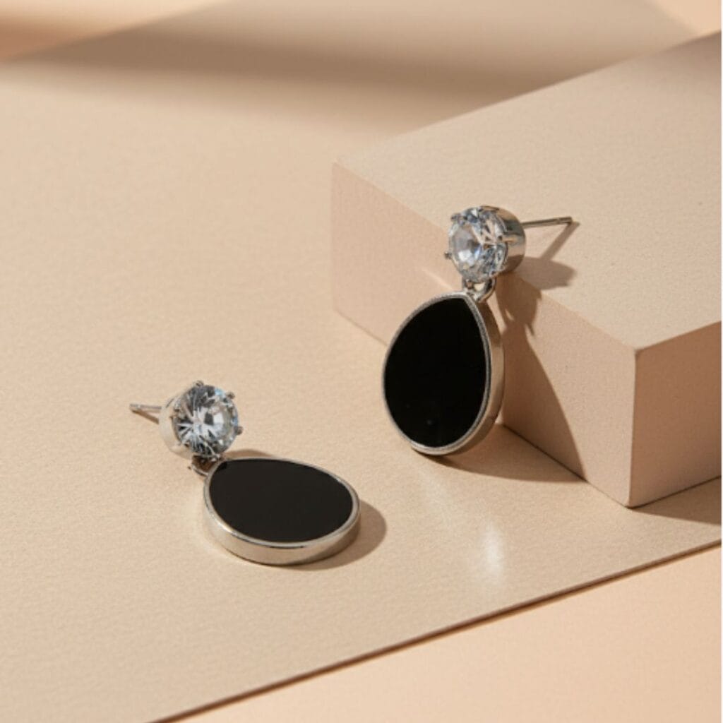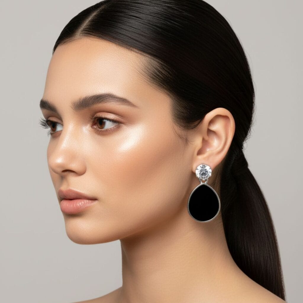 Each stone is precisely placed to enhance the overall symmetry and appeal of the teardrop shape. The glossy black & clear white combination symbolizes power & grace, making these earrings ideal for confident women who love refined style.