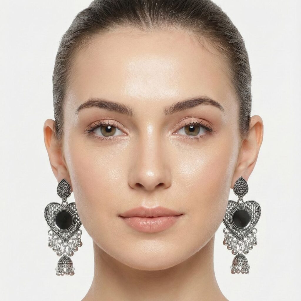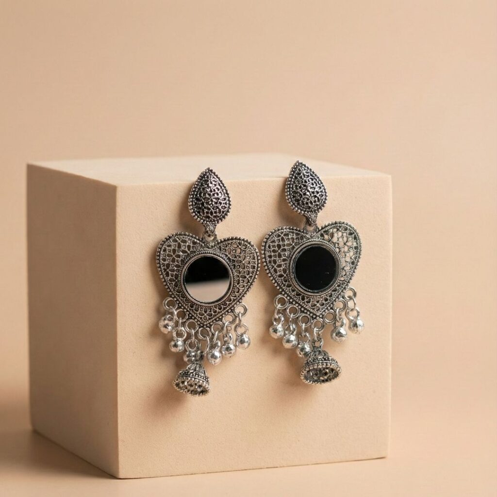 Add a timeless ethnic charm to your jewellery collection with our Mirror Heart Oxidised Silver Jhumka Earrings, designed for women who love traditional elegance with a bold statement. Crafted with intricate detailing, these oxidised silver jhumka earrings feature a beautiful heart-shaped frame with delicate mirror work at the center, giving them a rich vintage appeal.