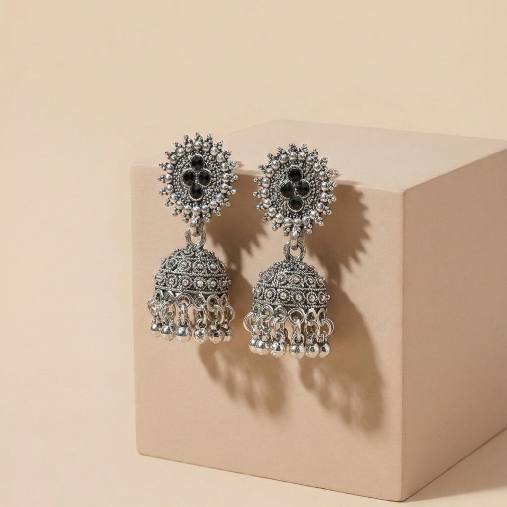 Ideal for women who appreciate traditional Indian earrings with a slightly bold edge, this pair adds character without being overly heavy. The black stone detailing makes these ethnic silver earrings versatile enough to style with both vibrant and neutral outfits.