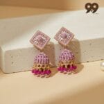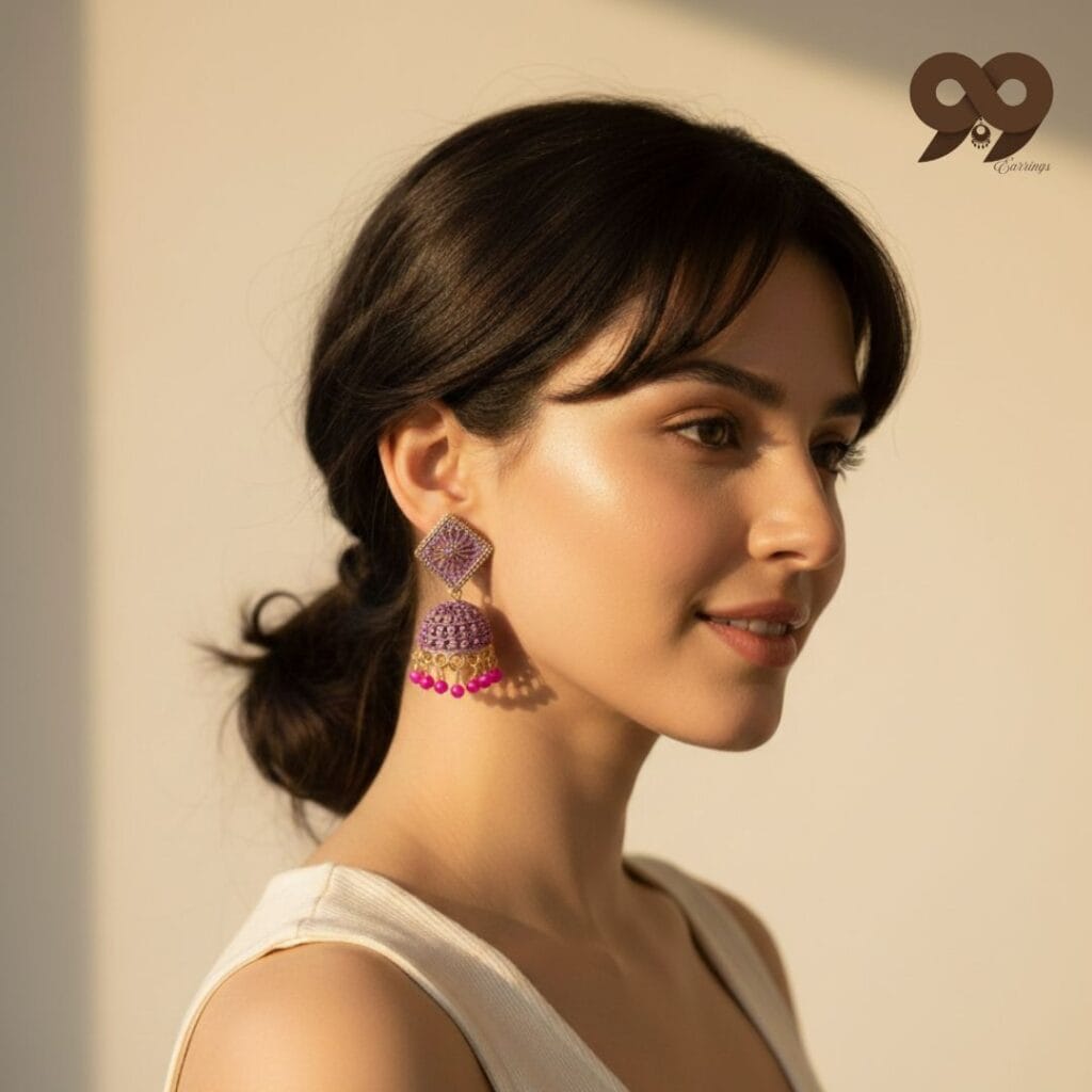 Redefine your ethnic elegance with our Lavender Diamond-Lattice Pastel Jhumkas, the ultimate jhumka earrings for sarees in the modern era. These earrings are specifically designed for the fashion-forward woman who loves to blend classic Indian traditions with trending pastel aesthetics. If you are searching for jhumka earrings for sarees that complement both silk and contemporary organza drapes, this lavender and fuchsia pair is your ideal styling partner.